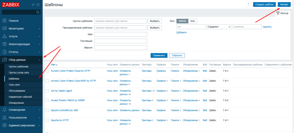Шаг третий, настройка Zabbix сервера. Скачиваем шаблон по ссылке и импортируем его в Zabbix.